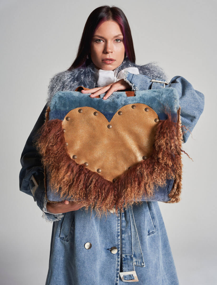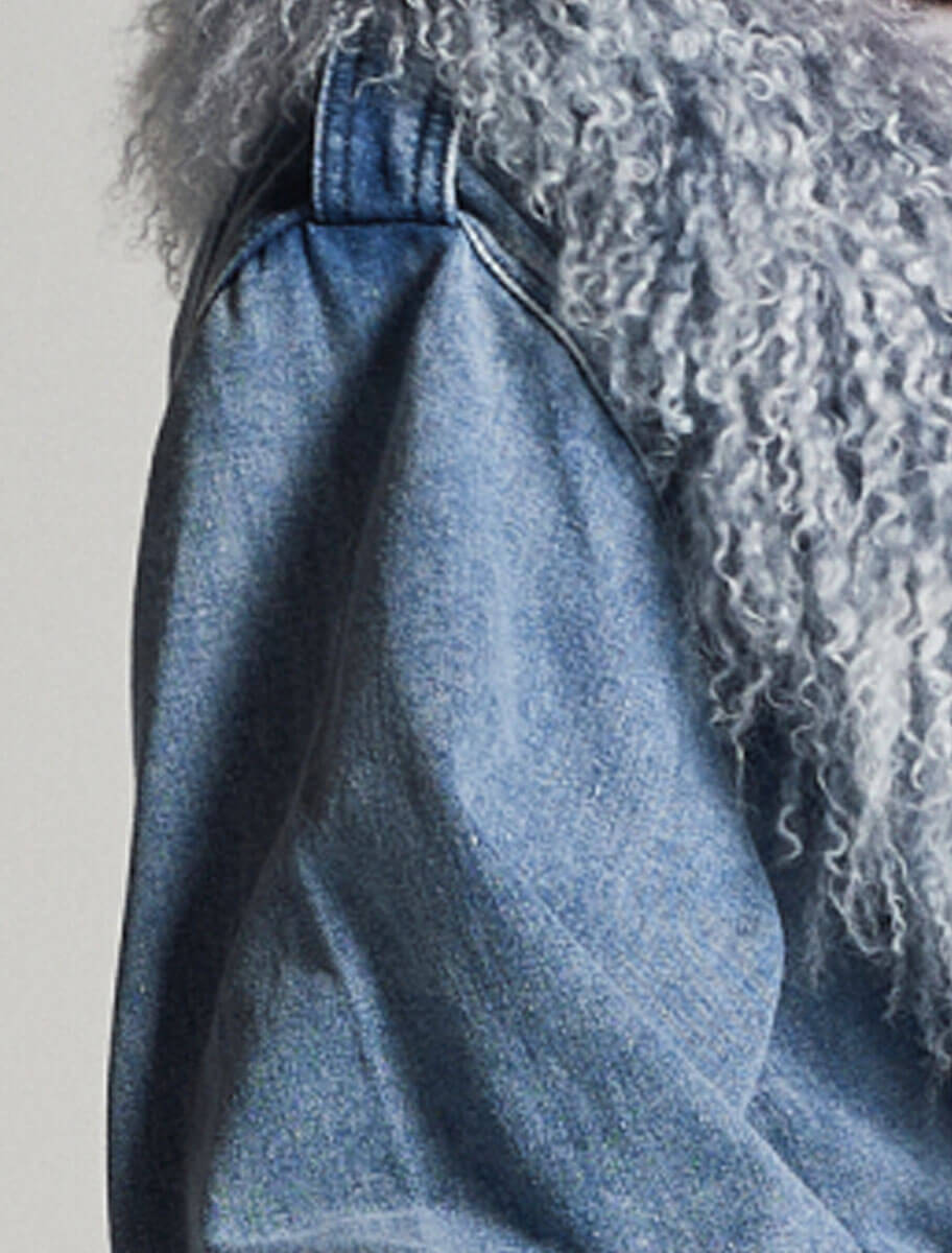 El abrigo está confeccionado en un tejido denim que se eleva con detalles de hebillas de nácar en las mangas y botones superpuestos que recorren el diseño. Su cierre frontal con botones y cinturón aporta estructura, mientras un gran cuello de cordero de Mongolia bicolor en azul y nata envuelve la silueta con sofisticación. Los bolsos en costura y un espectacular motivo floral bordado en la espalda completan un modelo que es, sin duda, el más atrevido de la colección, una fusión imponente de denim y pieles.