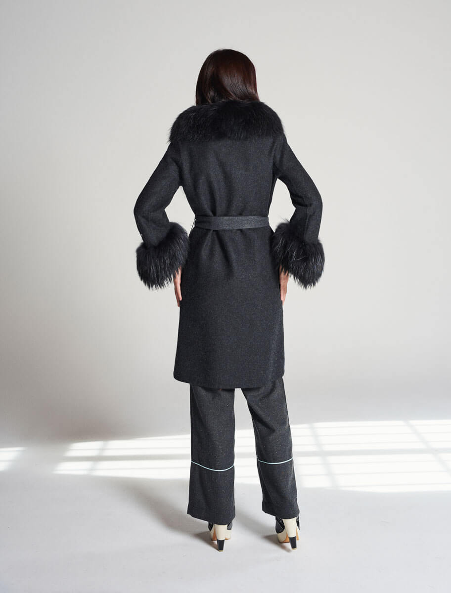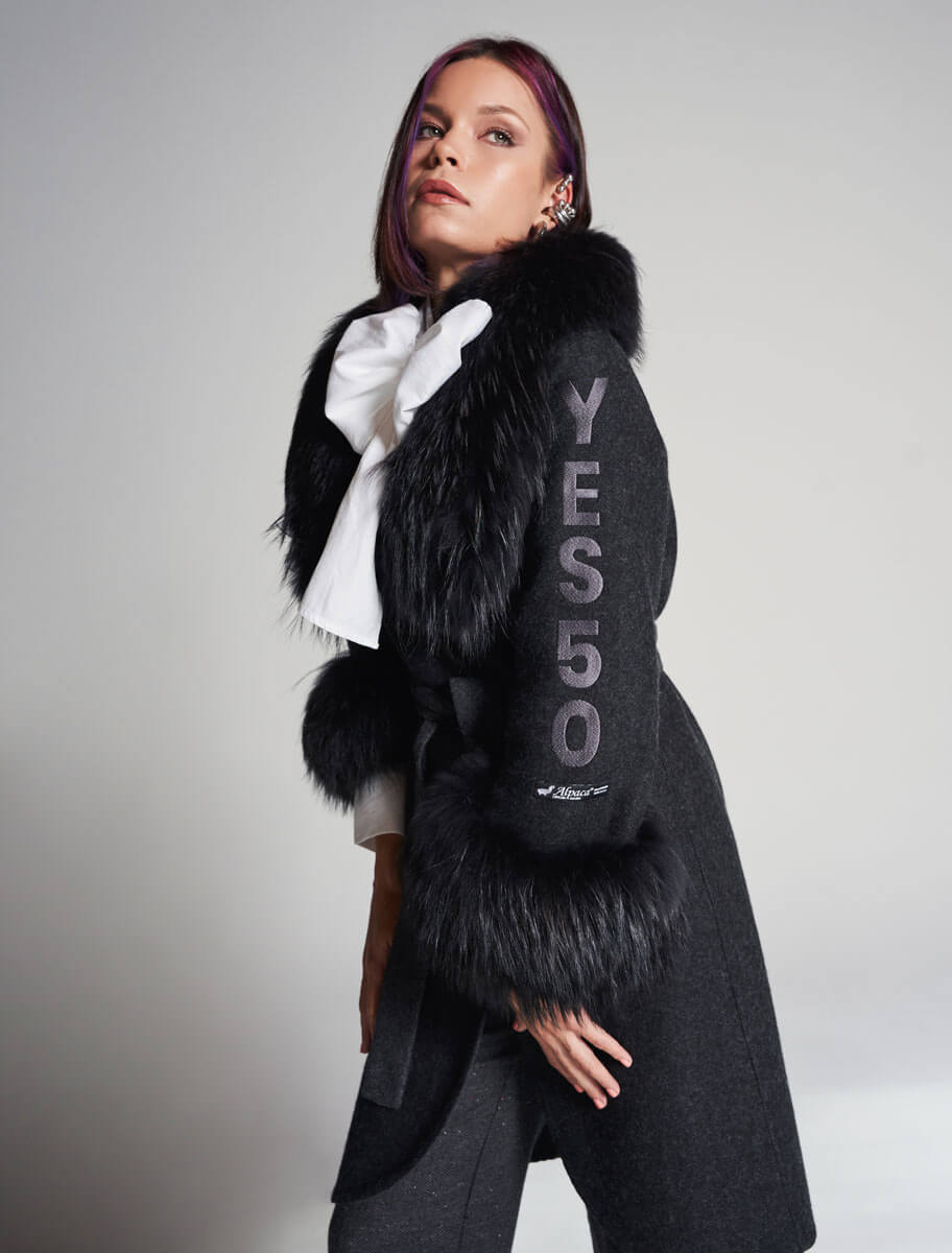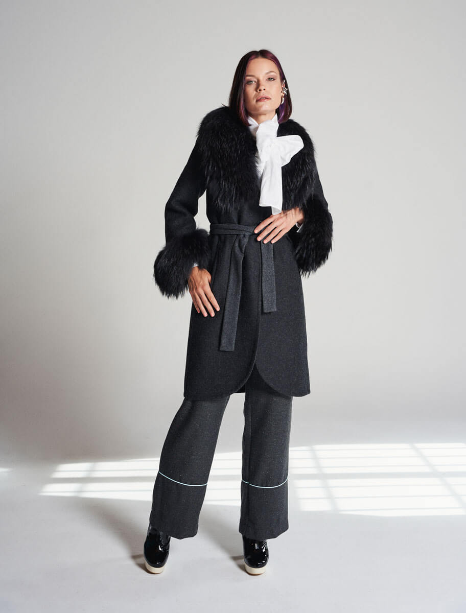 El cuello y los puños en piel natural de racoon negro refuerzan su carácter majestuoso, mientras que los bolsillos ocultos y el cinturón en alpaca aportan funcionalidad y estilizan la figura.