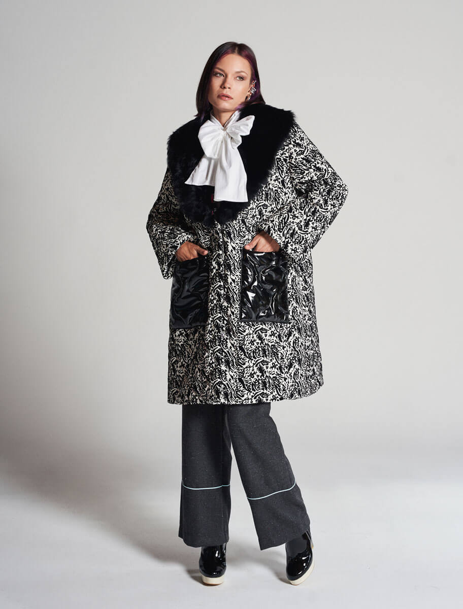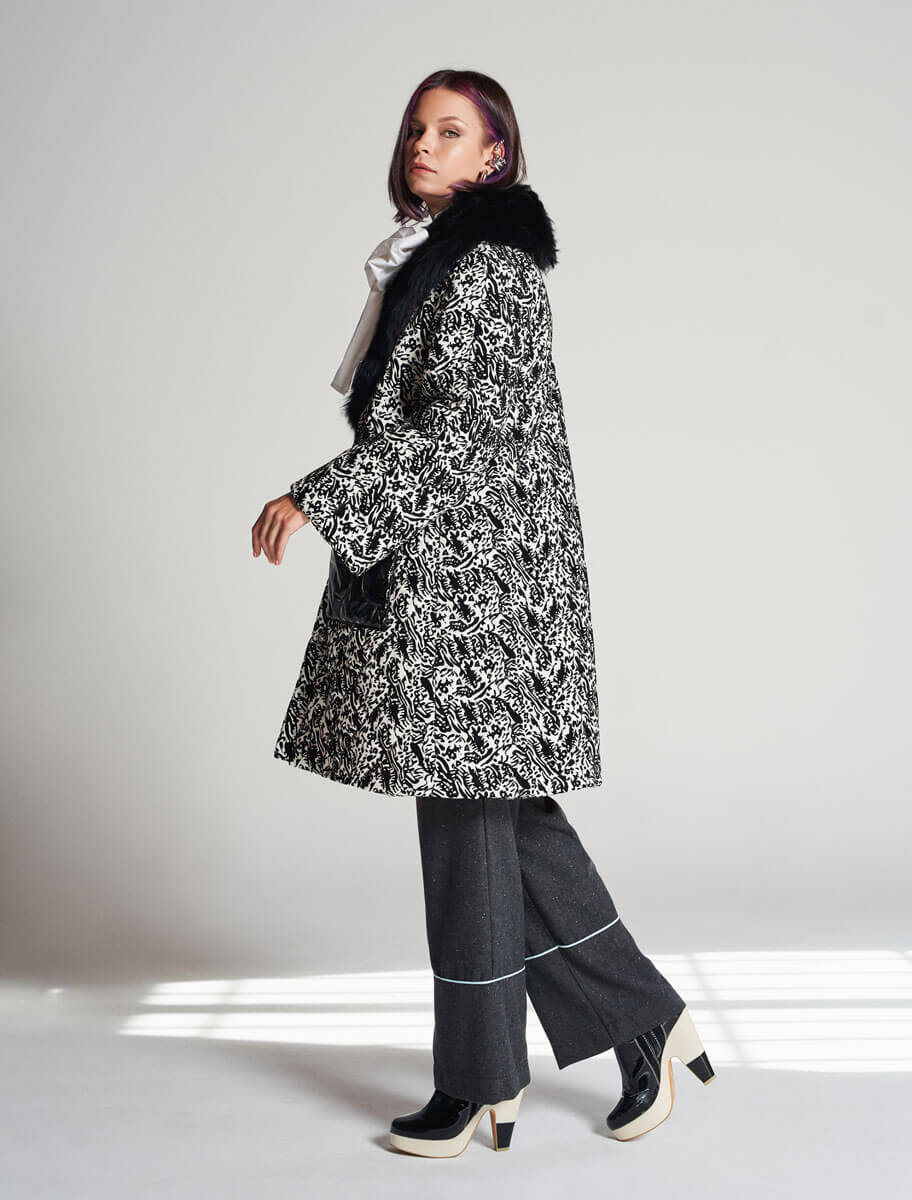 Confeccionado en tejido blanco de alta calidad con patrones negros en relieve que evocan geometrías orgánicas, este abrigo combina diseño contemporáneo con tradición textil asturiana. Su cuello negro de pelo suave aporta un contraste impactante, enmarca el rostro y refuerza su presencia sofisticada.