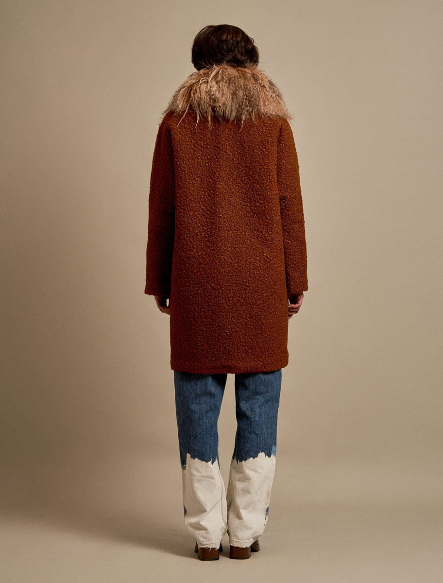 Abrigo marrón tejido rizo. Cerrado frontal con clip, cuello de cordero de Mongolia y Yak, bolsos en costura. Forro de seda natural.