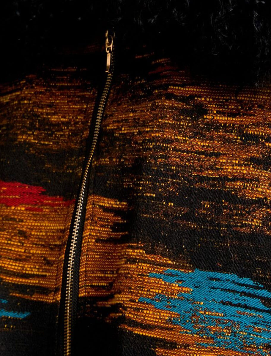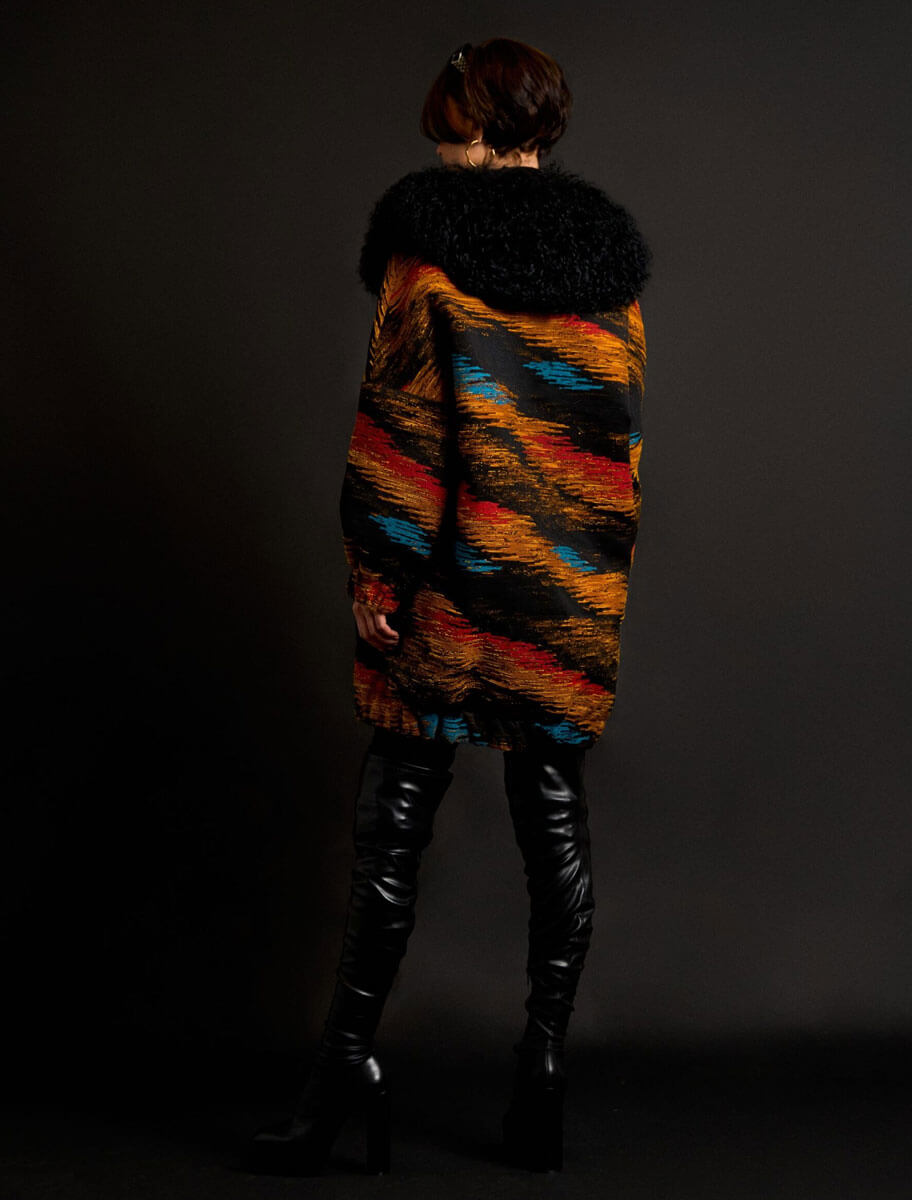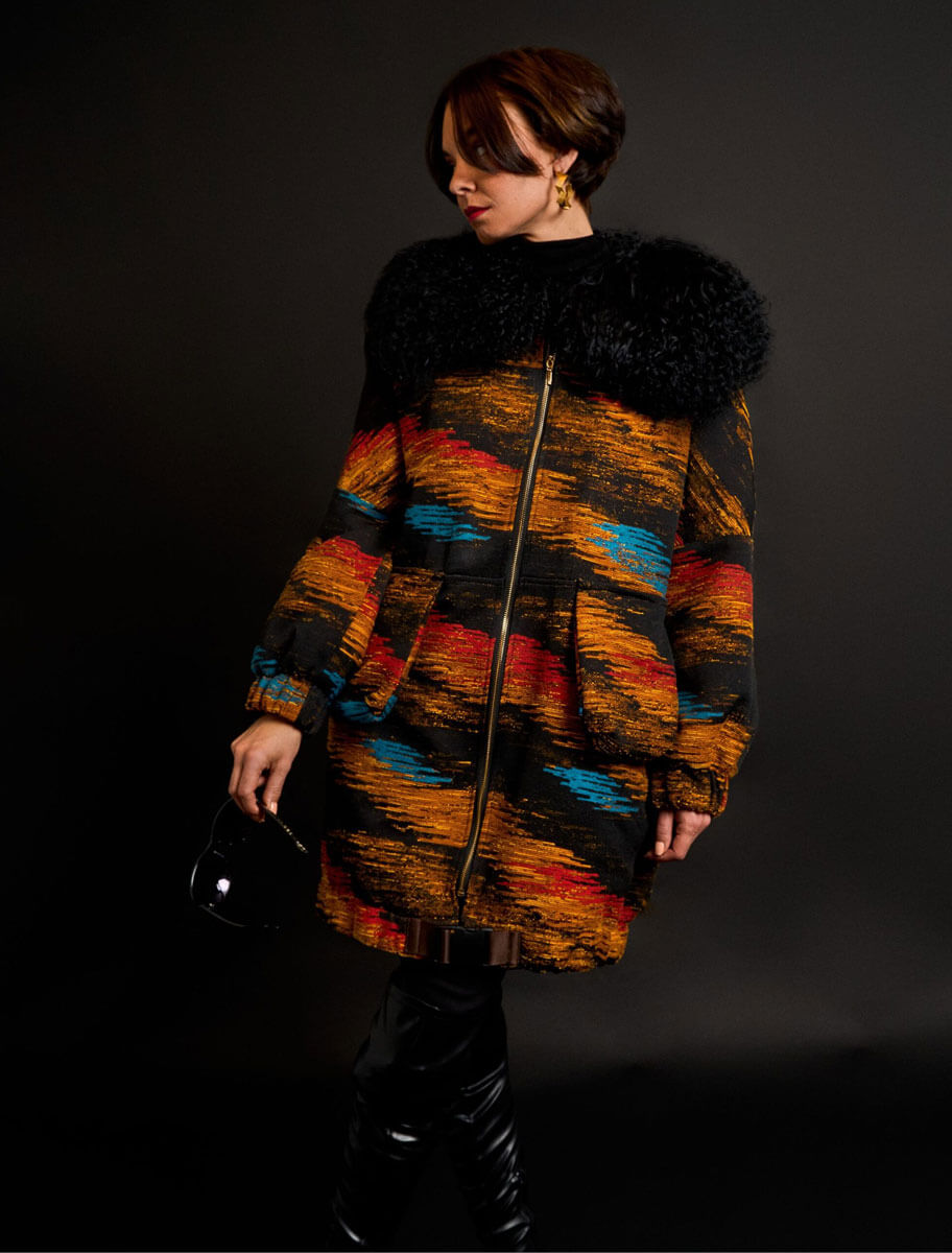 Abrigo tejido decorado rayas. Cerrado frontal con cremallera, cuello desmontable de cordero de Mongolia, puños cerrados con goma. Bolsos al aire. Forro de seda natural.
