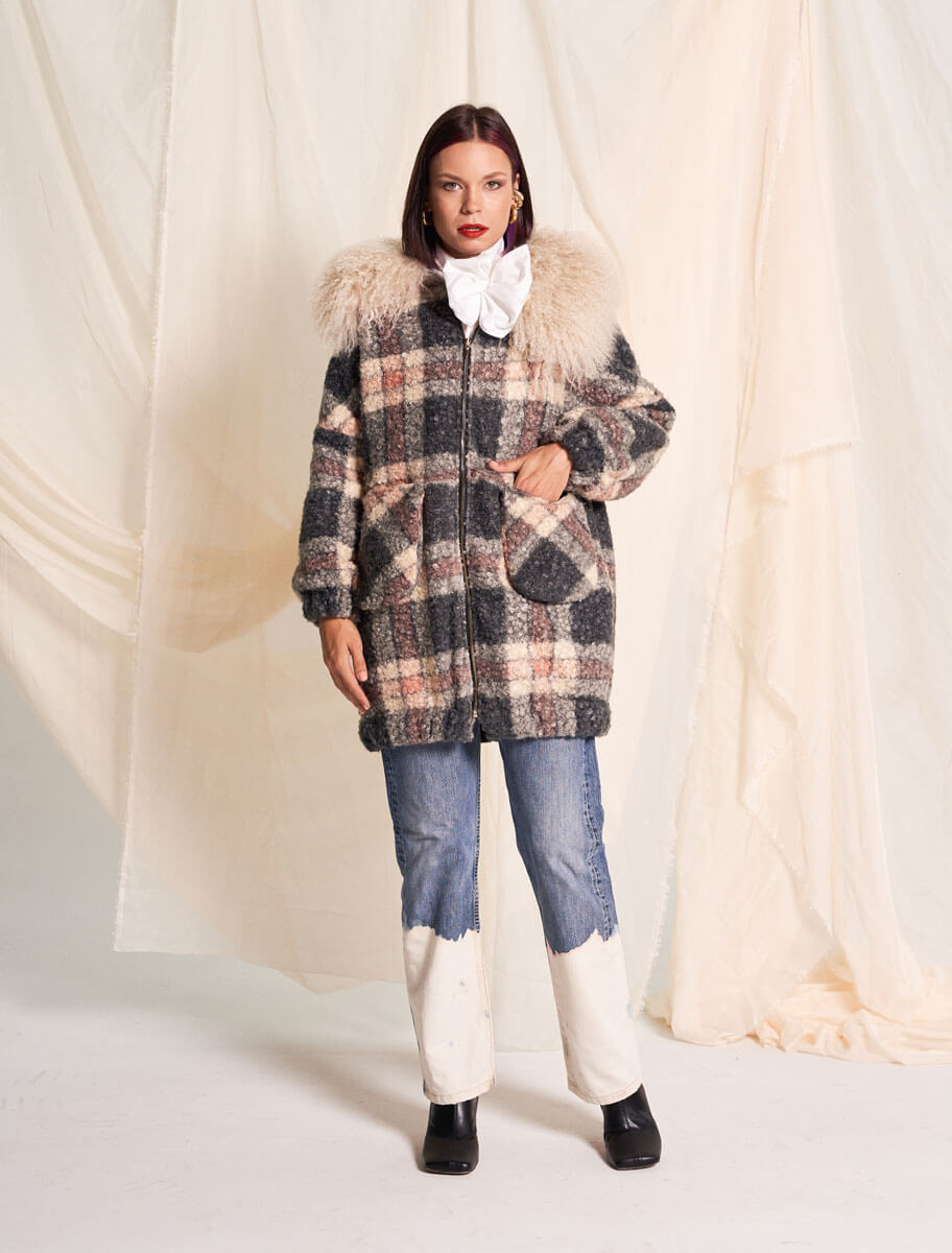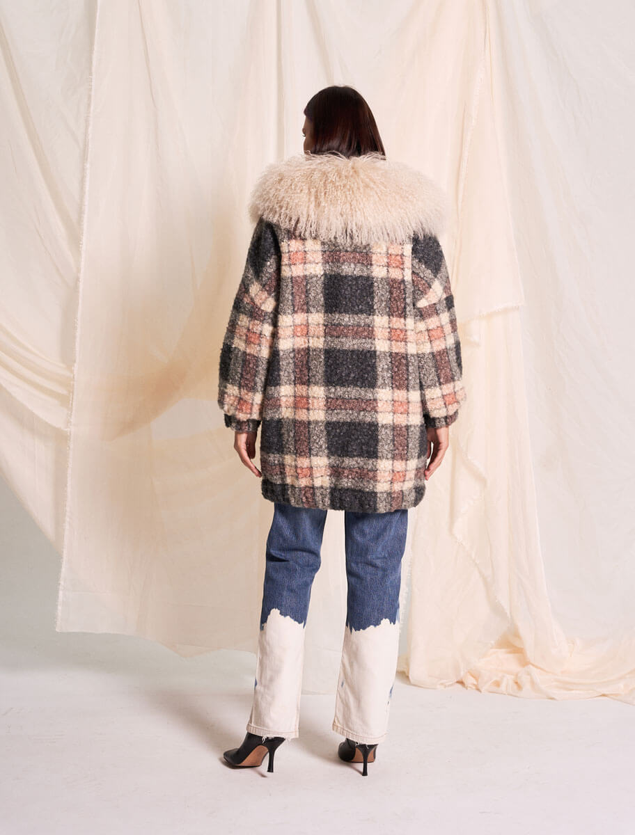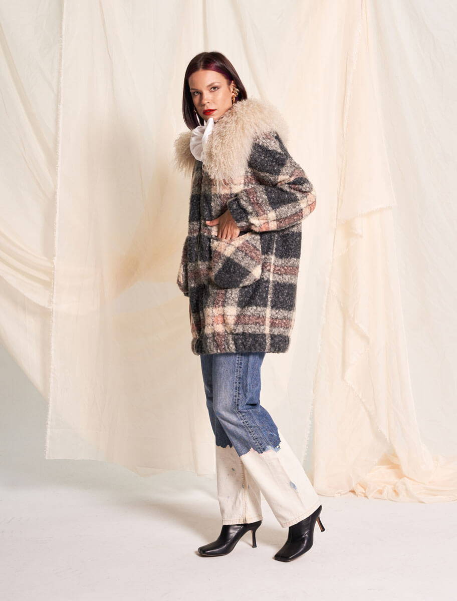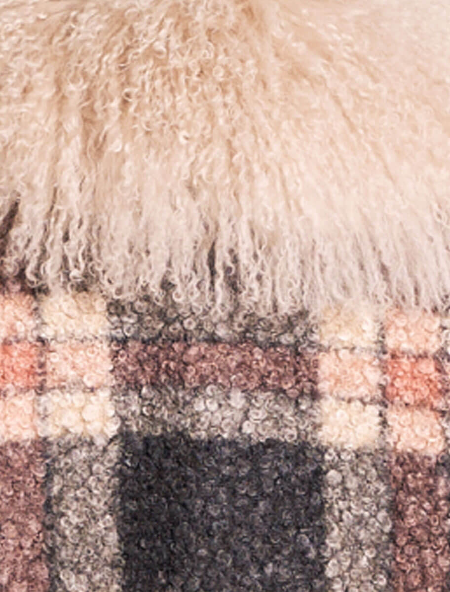 Confeccionado en un tejido cálido de cuadros rosas y natas sobre fondo gris, evoca los atardeceres de invierno donde la claridad se abre paso entre las sombras. El diseño incluye un cuello de cordero de Mongolia en tono nata, que ilumina la silueta con sofisticación.