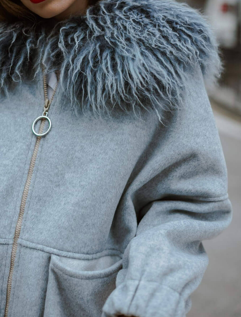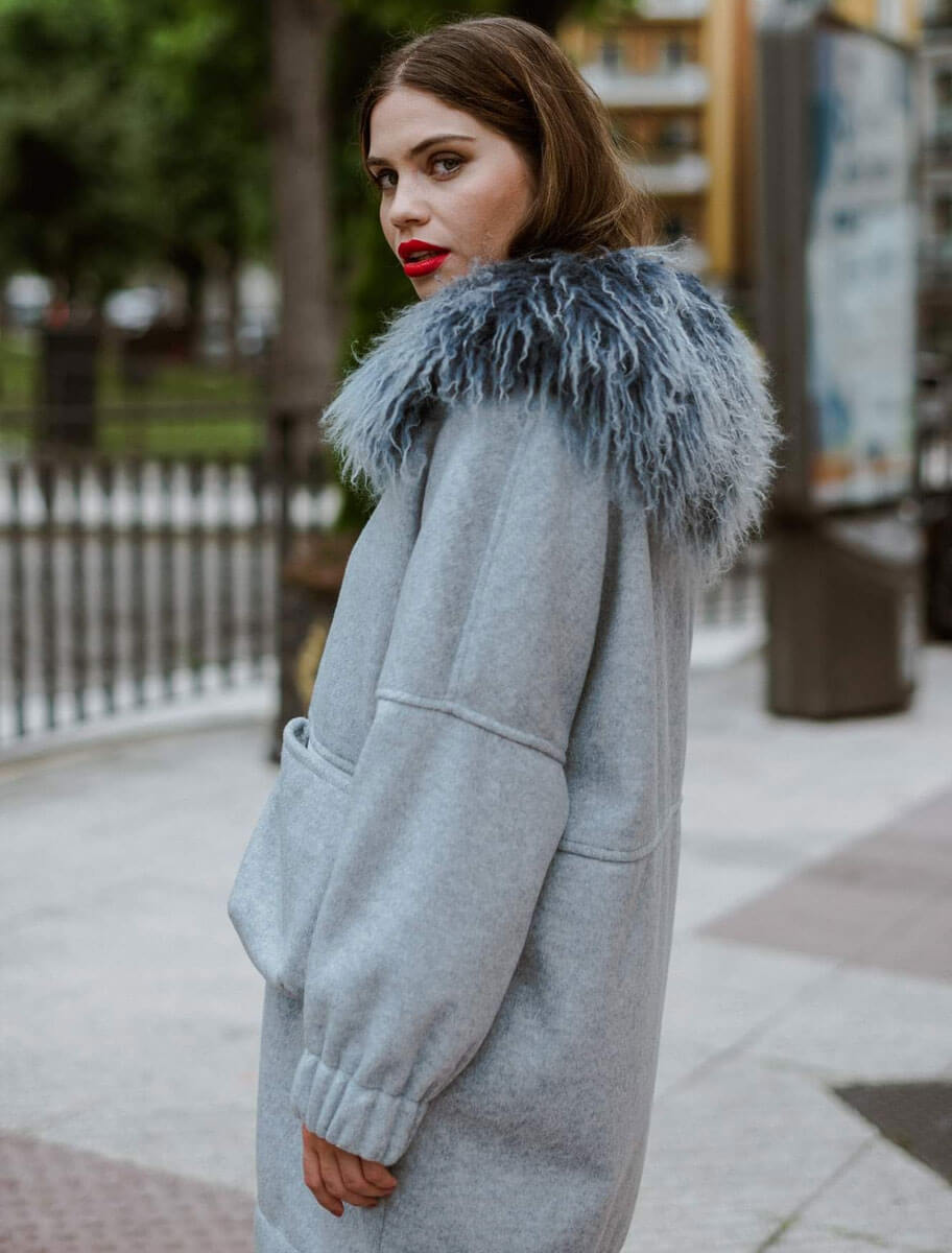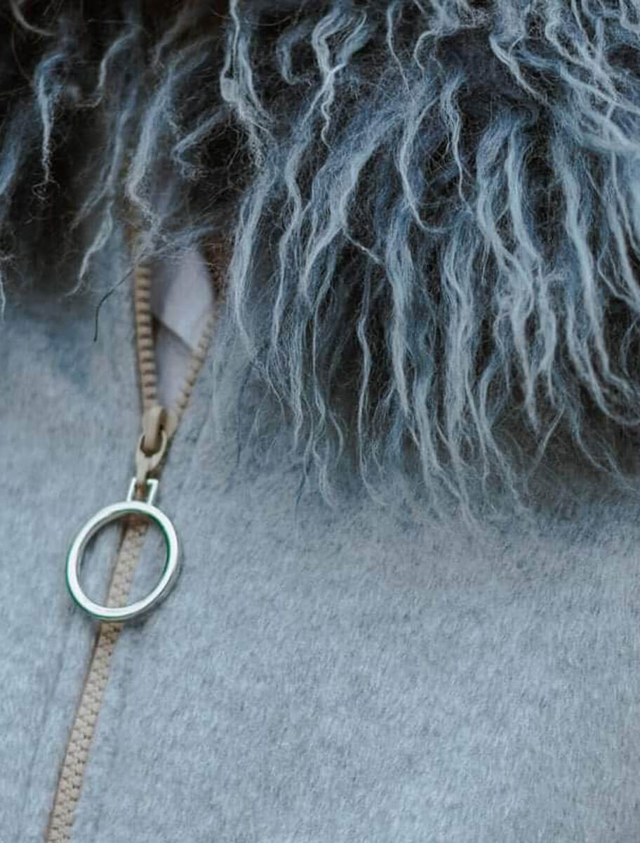 Abrigo oversize confeccionado en suave paño azul, con cierre frontal de cremallera y espectacular cuello desmontable en piel natural de cordero de Mongolia en azul con puntas blancas. De silueta envolvente y volumen relajado, este diseño cuenta con bolsillos al aire, puños cerrados con goma y un elegante forro interior de seda natural con estampado de lunares.