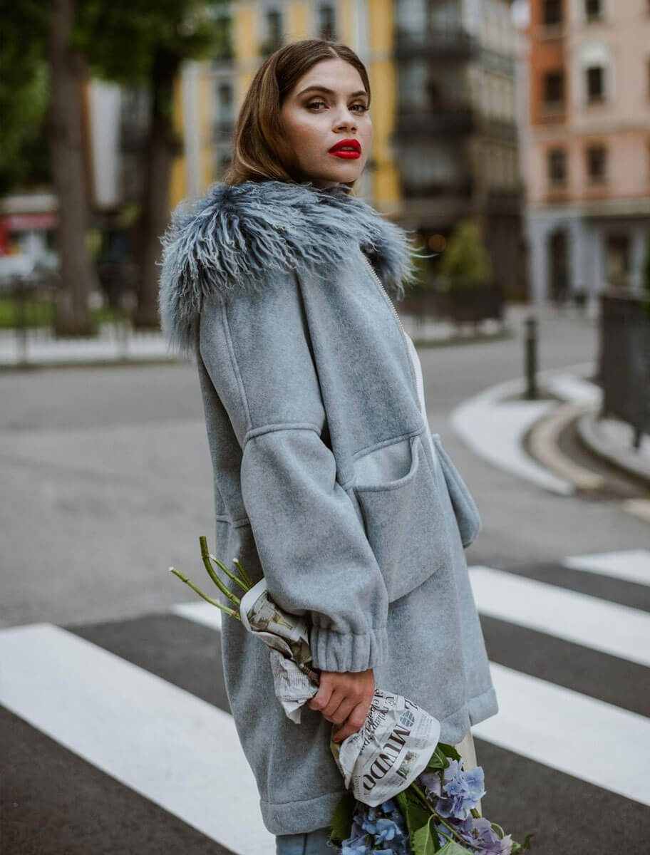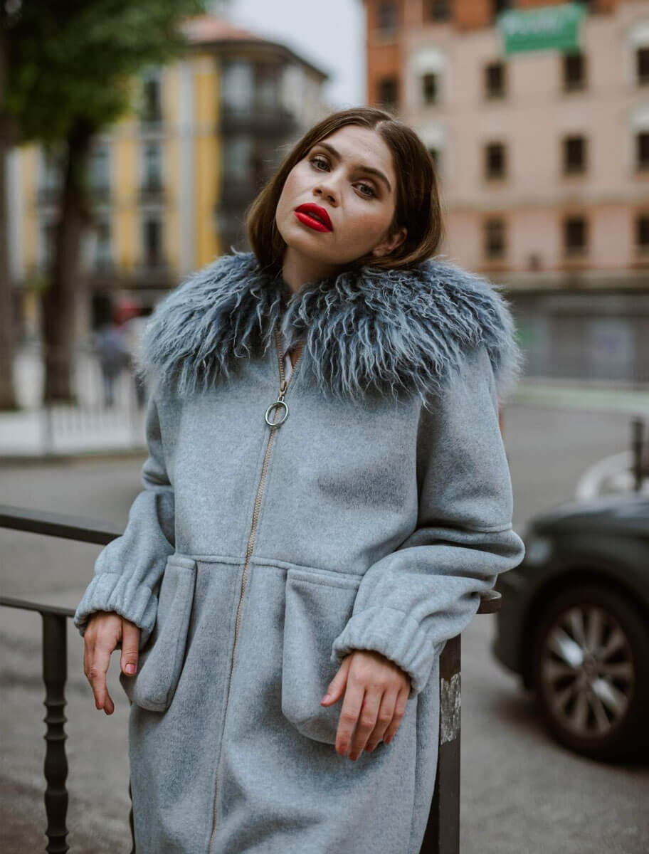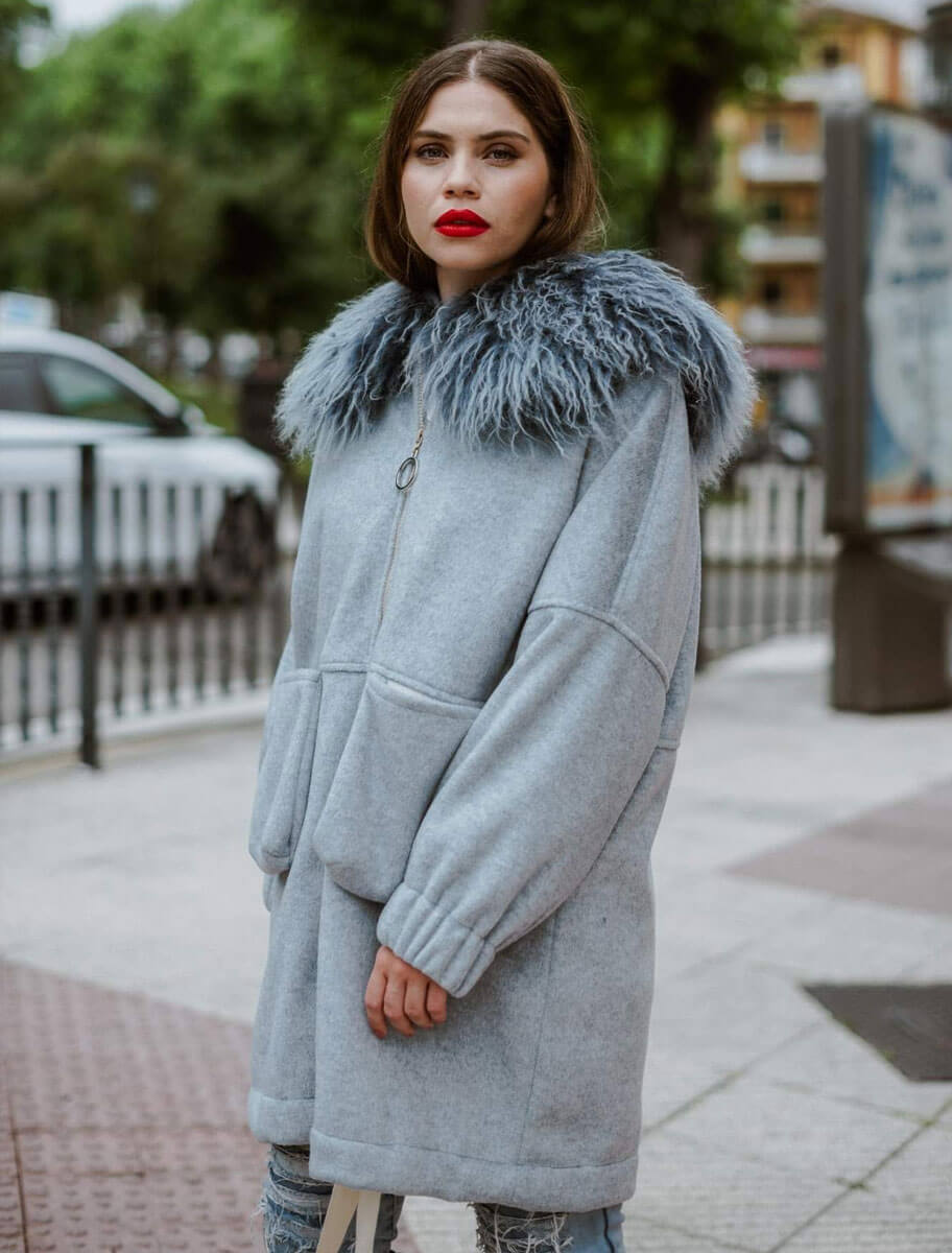Abrigo oversize confeccionado en suave paño azul, con cierre frontal de cremallera y espectacular cuello desmontable en piel natural de cordero de Mongolia en azul con puntas blancas. De silueta envolvente y volumen relajado, este diseño cuenta con bolsillos al aire, puños cerrados con goma y un elegante forro interior de seda natural con estampado de lunares.