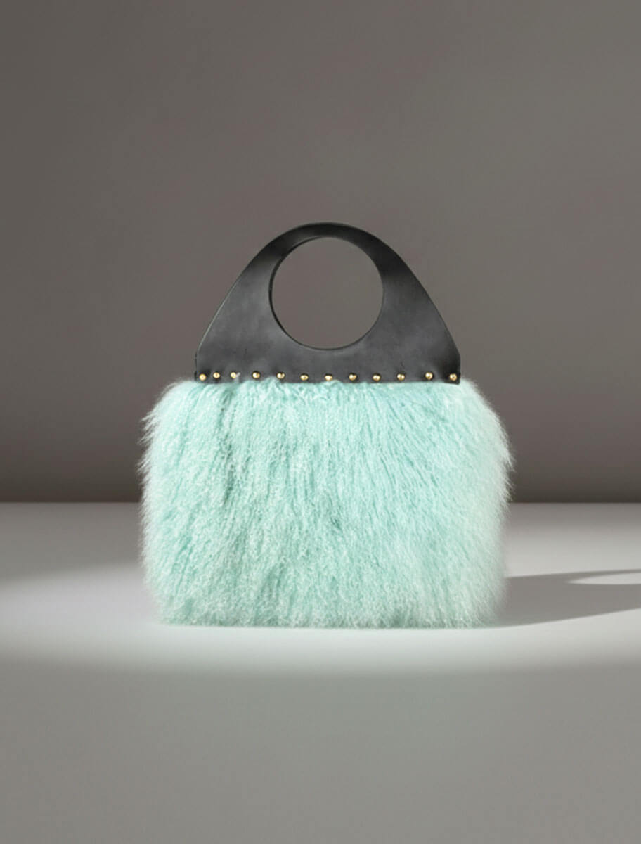 El Bolso Gerbera aguamarina representa la calma del hielo y la pureza del color. Elaborado en piel de cordero de Mongolia en un tono verde azulado, se completa con un asa de cuero natural en negro, logrando una combinación de contraste y sofisticación.