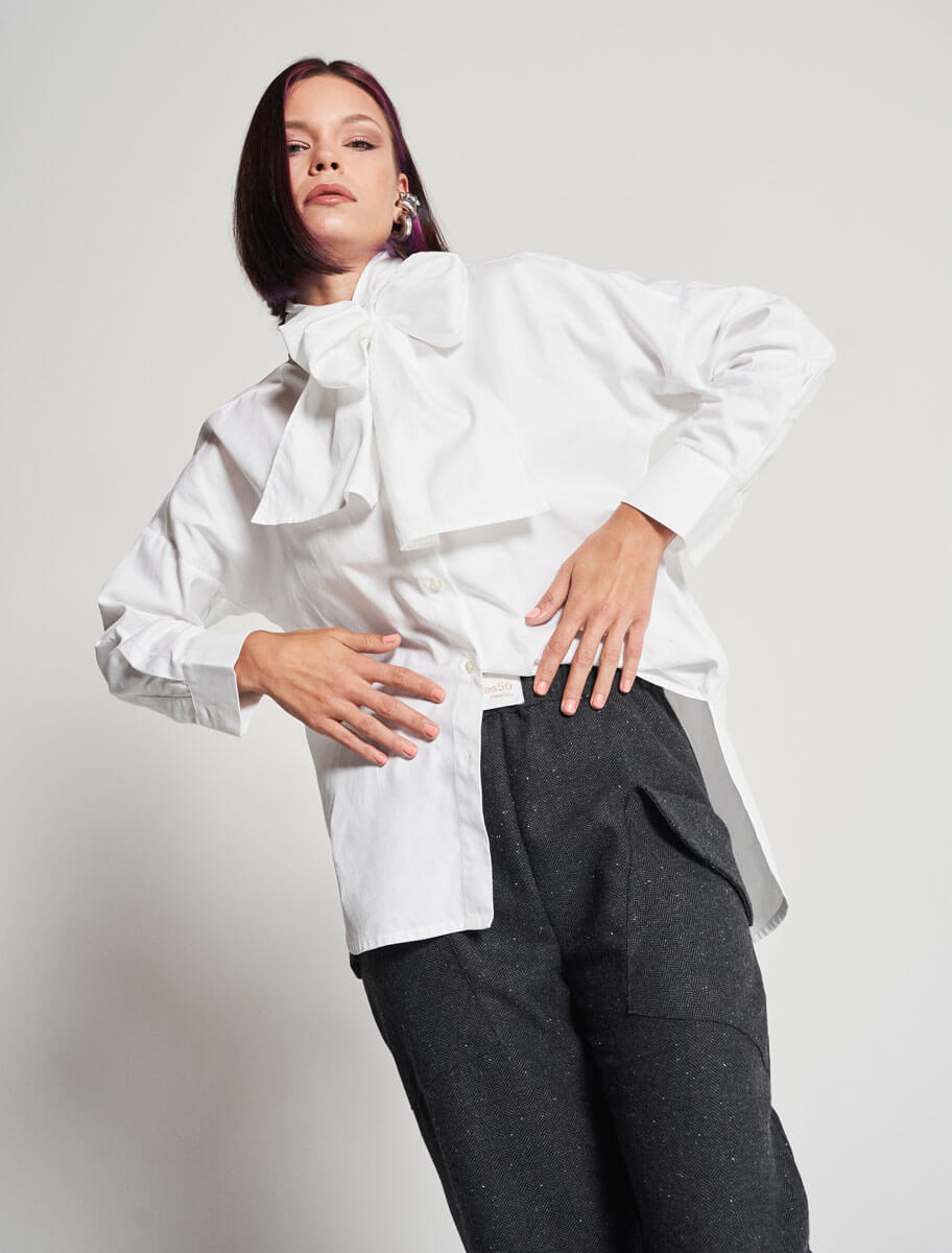 Su diseño atemporal con cuello alto rematado con un lazo oversize le aporta una elegancia rotunda y una versatilidad absoluta. Es una camisa que respira estilo, ideal para looks sofisticados tanto de día como de noche. El patronaje está pensado para favorecer sin esfuerzo, con un corte limpio que realza la silueta sin ajustar.
