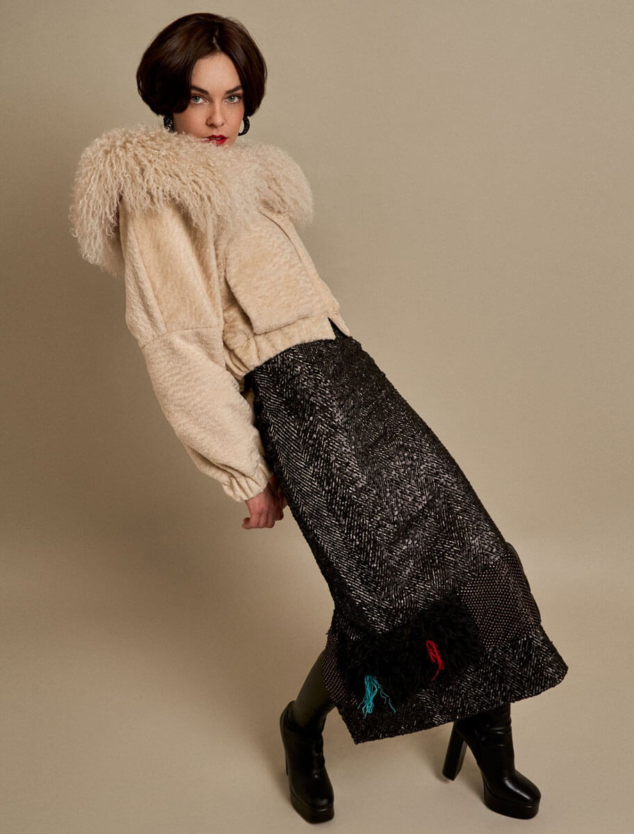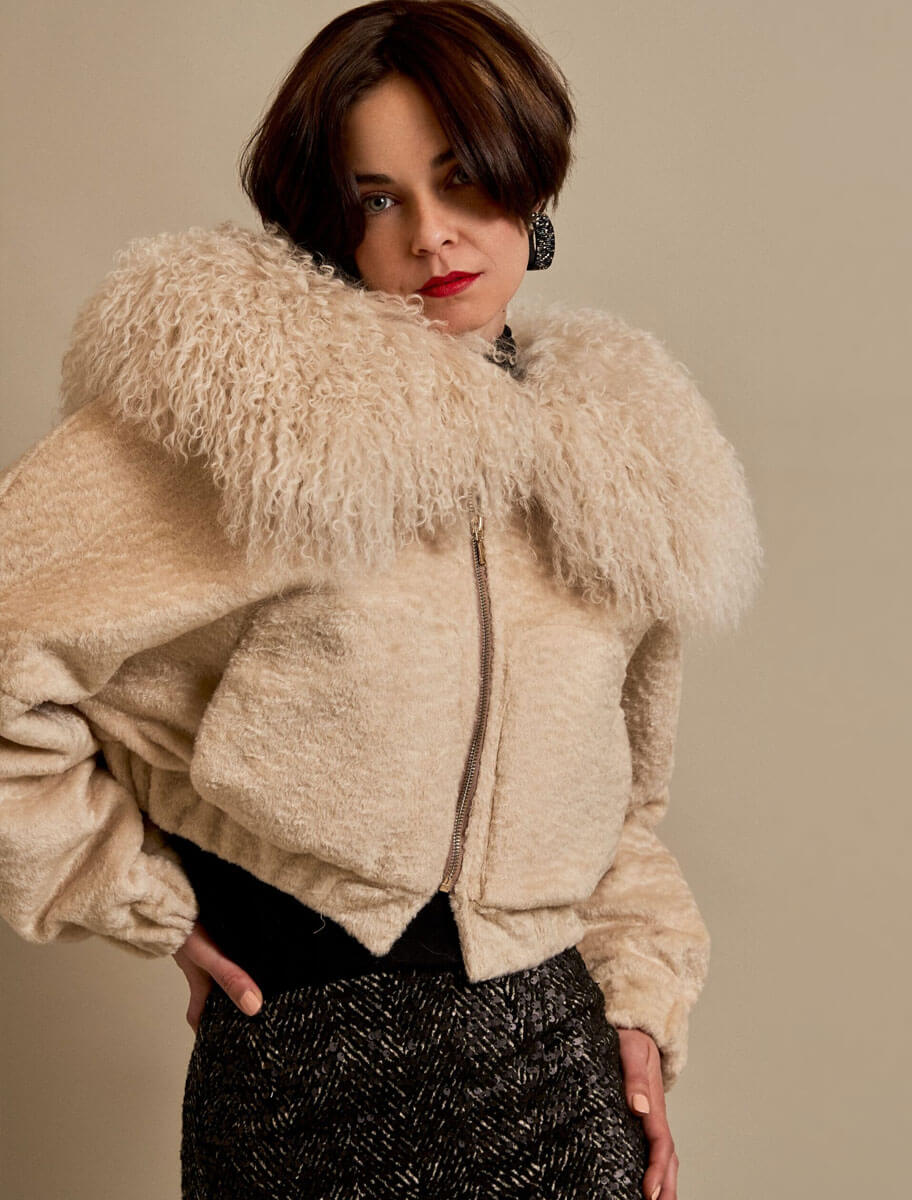 Cazadora Amariega Beige de la firma Yes50, confeccionada en tejido astracán de tacto suave y cálido, en tono nata. Destaca por su cuello envolvente de auténtico cordero de Mongolia en color natural, totalmente desmontable para mayor versatilidad. Su cierre frontal con cremallera metálica, bolsos superpuestos y puños con goma aseguran un ajuste cómodo y funcional.