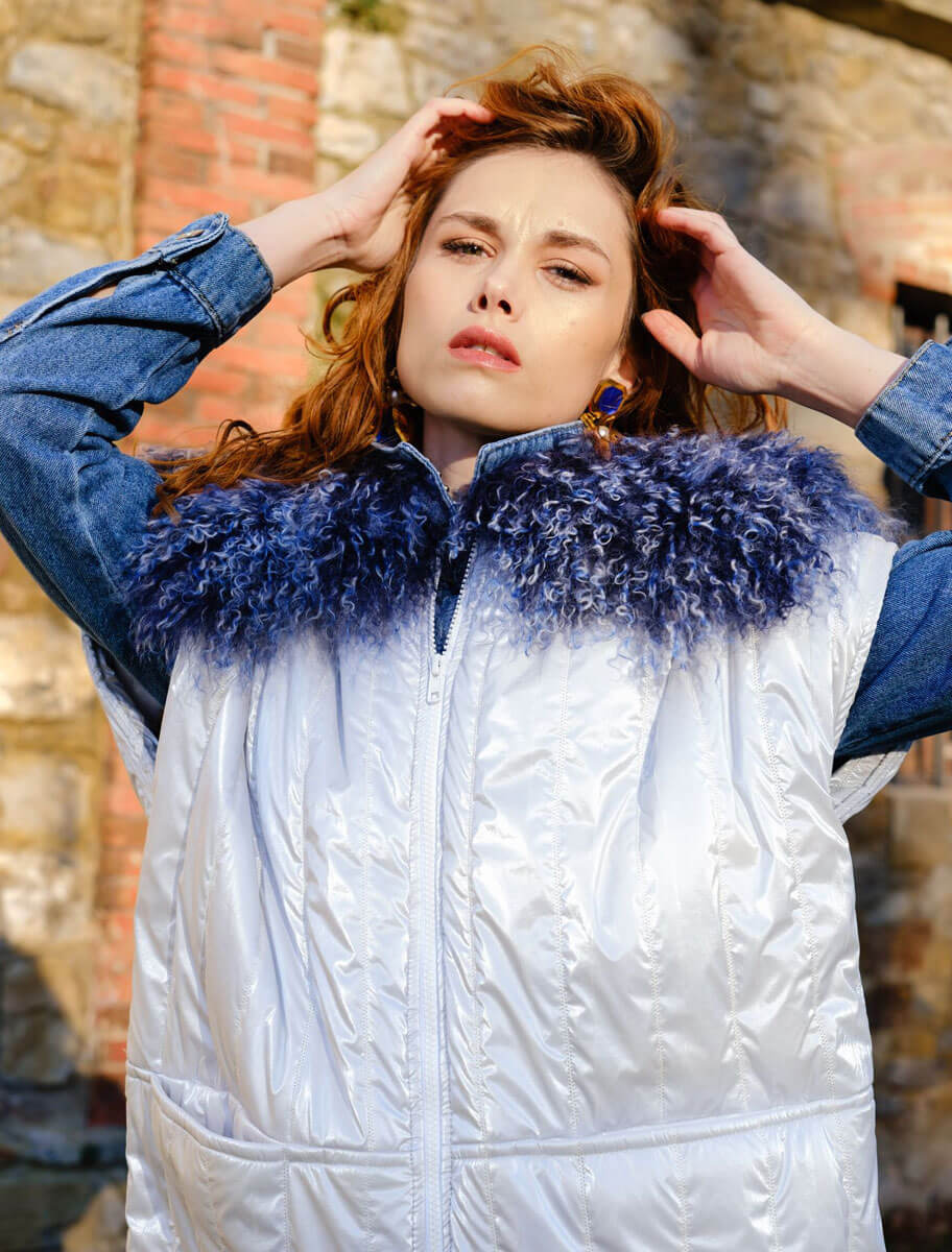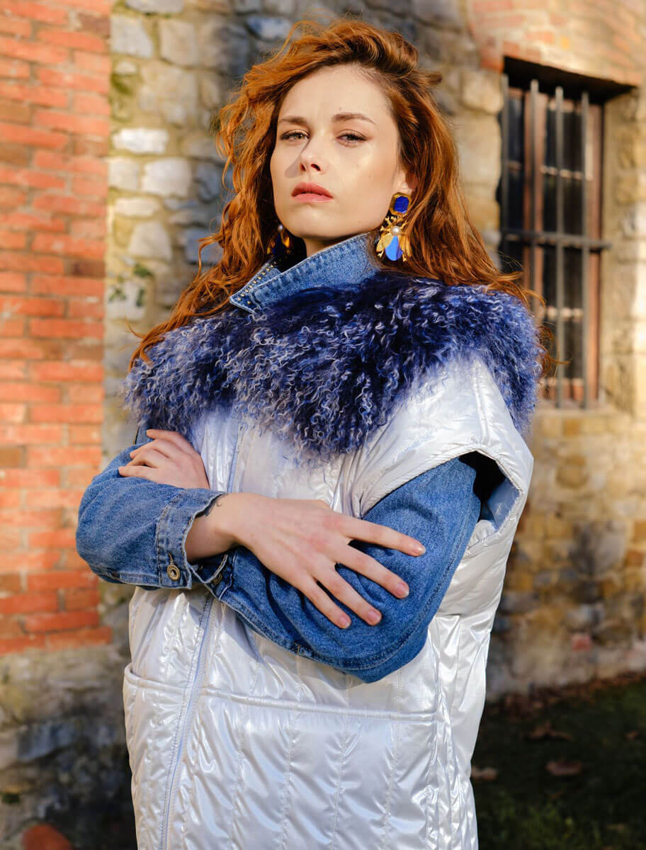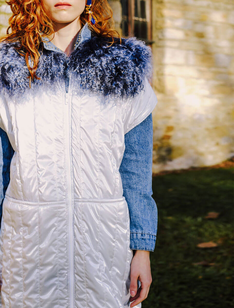 Su característico cuello bicolor de auténtico cordero de Mongolia, en blanco y azul profundo, es desmontable, permitiendo transformar el look según la ocasión: sofisticado y envolvente con el cuello, ligero y minimalista sin él. Los bolsillos ocultos en costura mantienen la pureza del diseño y la funcionalidad de una prenda hecha para el día a día con estilo.