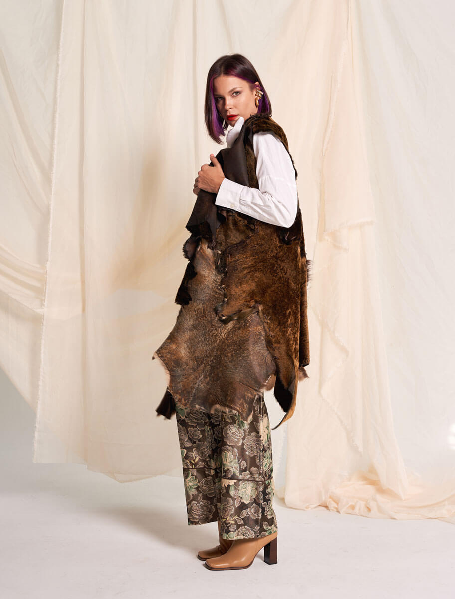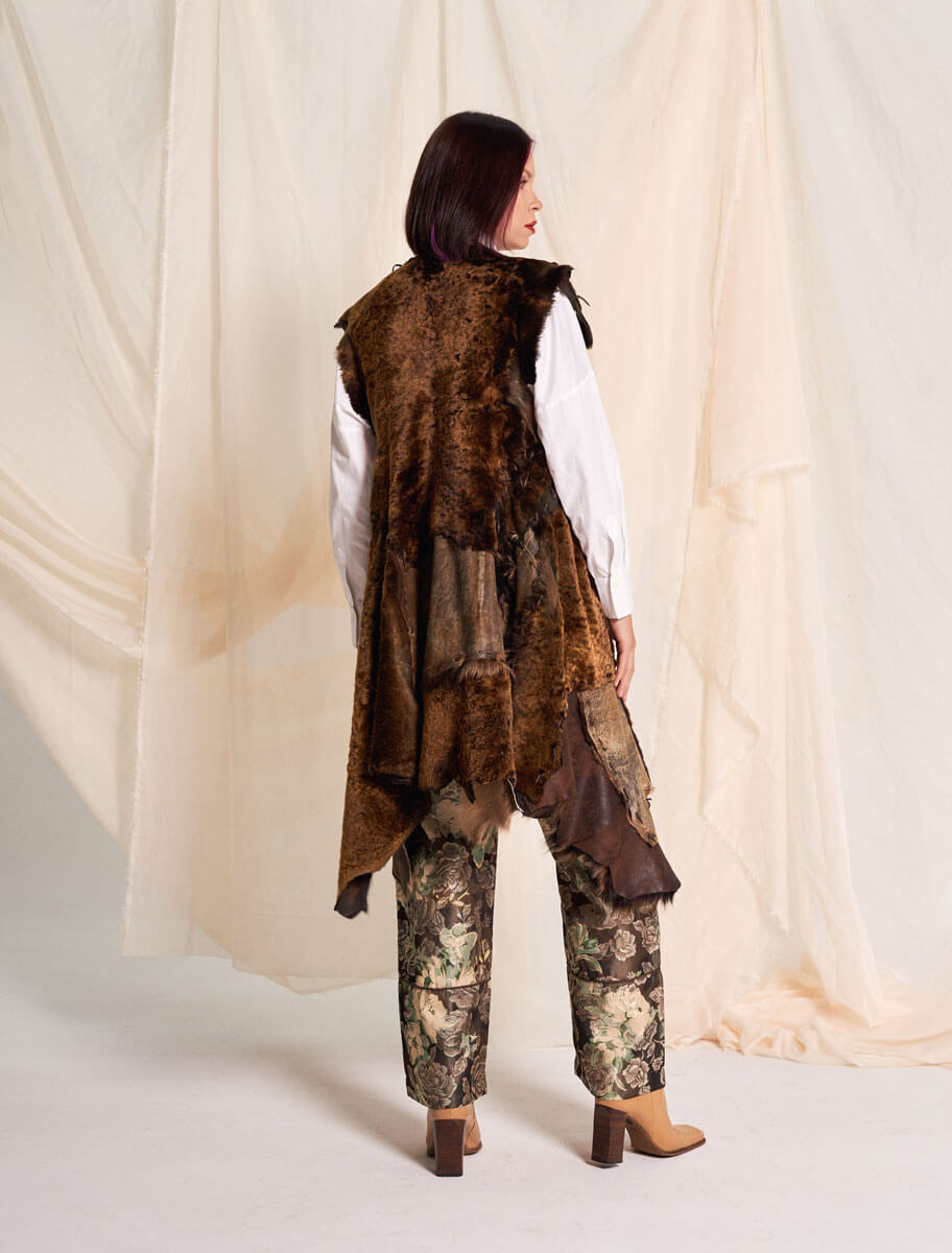 Confeccionado artesanalmente en nuestro taller de Sotrondio, Asturias, el Viola es una pieza única realizada a partir del reciclaje de retales de pieles naturales, lo que lo convierte en un chaleco irrepetible. Cada fragmento ensamblado refleja el saber hacer de la alta costura española, donde tradición y modernidad se entrelazan.
