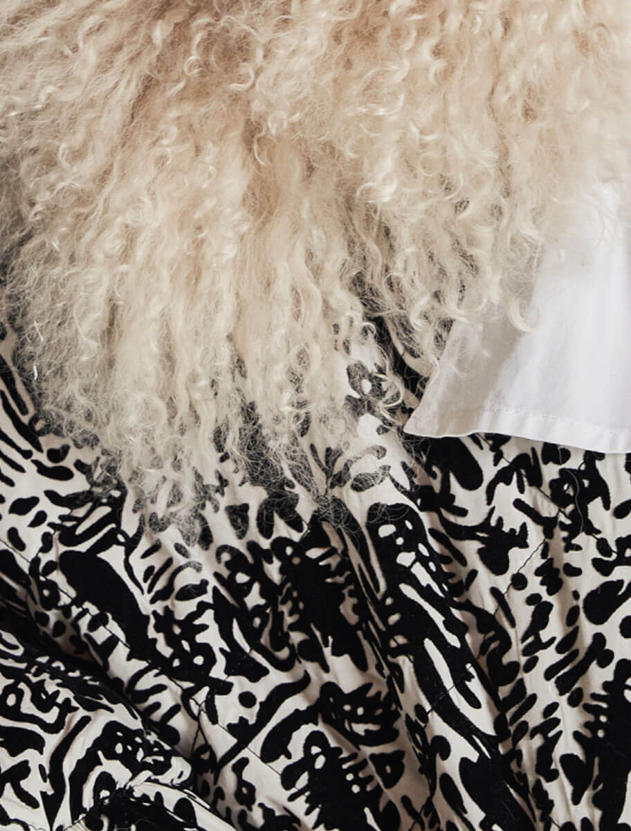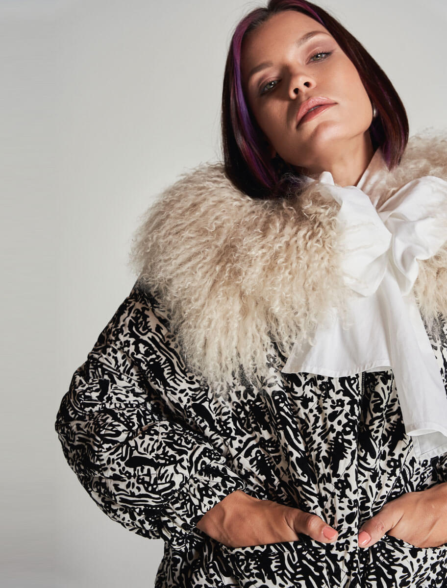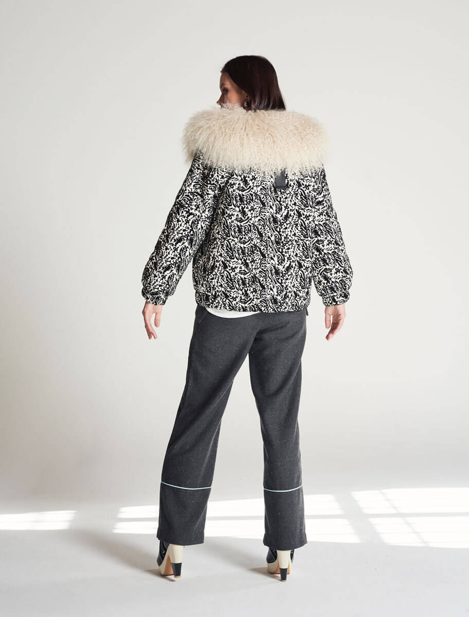 Inspirada en la belleza serena de los inviernos asturianos, la Chaqueta Flor de Nieve de Yes50 es una prenda que combina elegancia, tradición y modernidad. Confeccionada de manera artesanal en nuestro taller de Sotrondio, esta pieza única presenta un tejido blanco con motivos negros que evocan la escarcha invernal, y se realza con un espectacular cuello desmontable de cordero de Mongolia en tono natural.