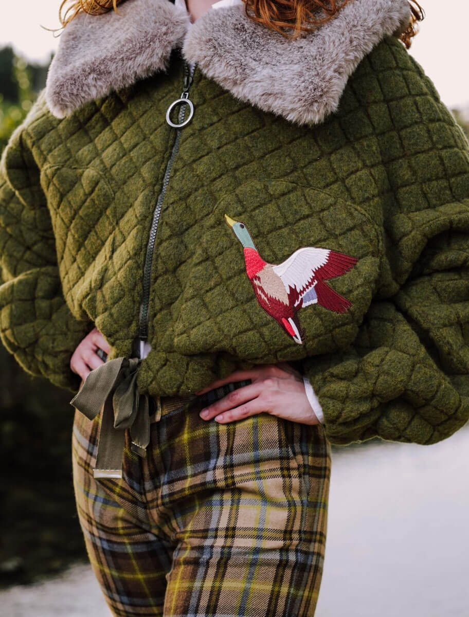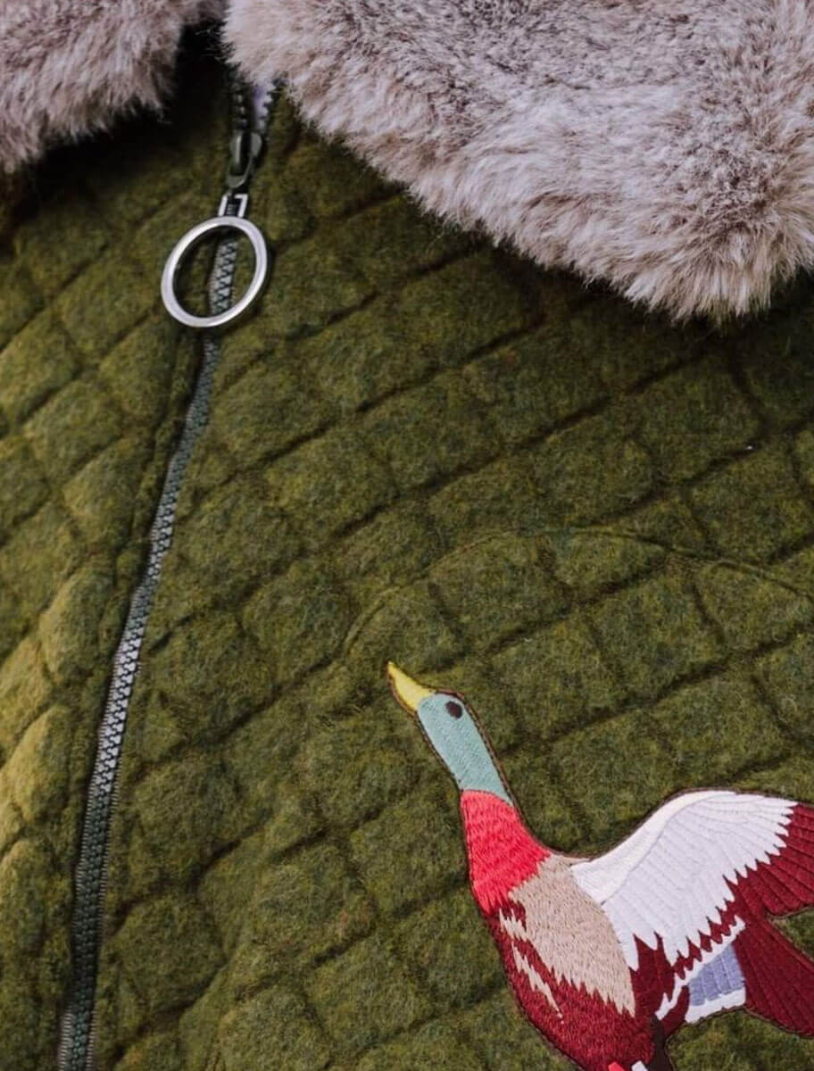Su cuello amplio en piel natural gris recrea la niebla al amanecer, y su bordado artesanal de un pato en vuelo simboliza la libertad, el movimiento y la conexión con la naturaleza. Con detalles cuidados y silueta oversize, esta cazadora representa el equilibrio perfecto entre diseño exclusivo, tradición y funcionalidad contemporánea.
