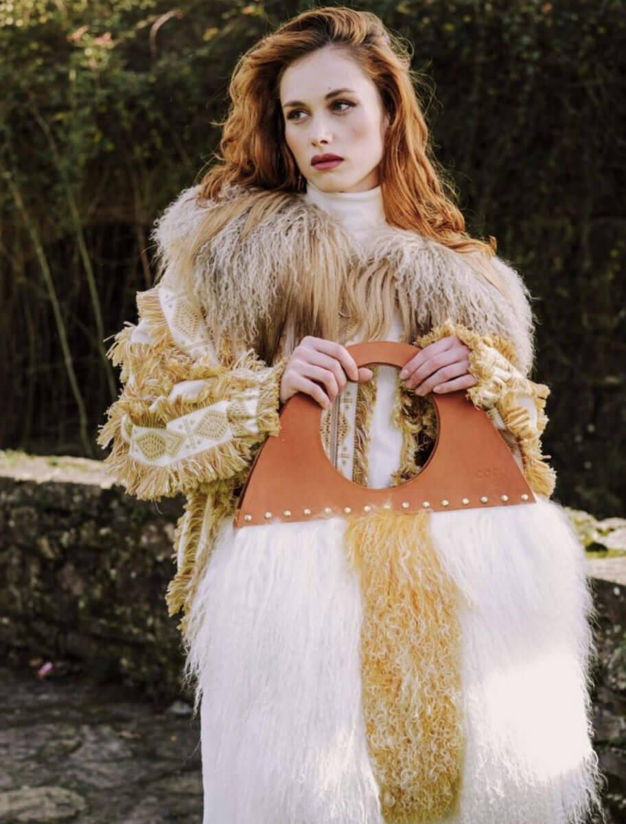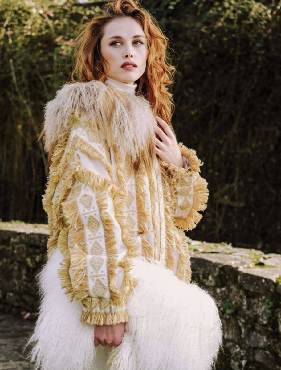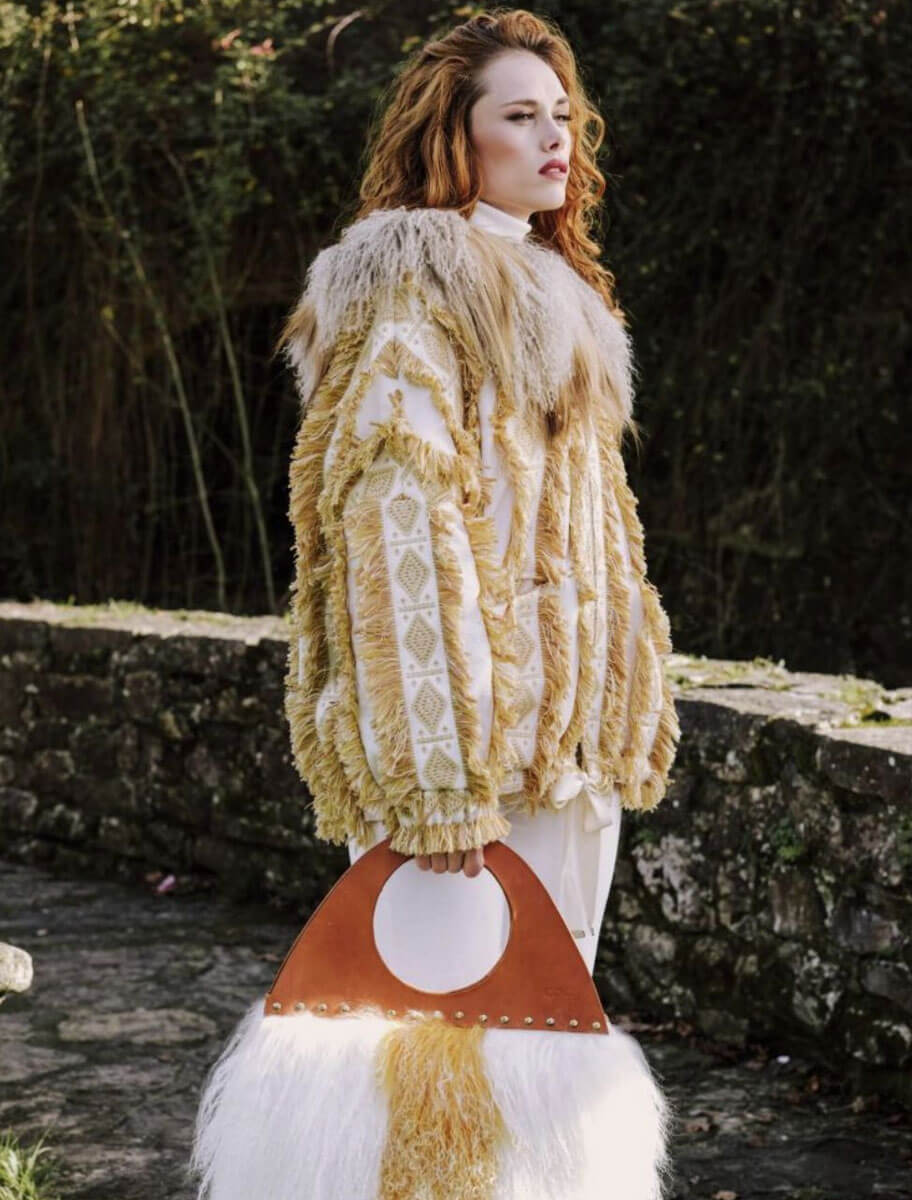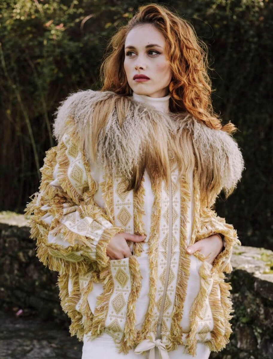 La Chaqueta Sama en tono beige dorado es una prenda de alta costura que redefine el lujo artesanal. Confeccionada en un tejido, procedente de telares franceses, estructurado de base cruda y bordado geométrico en relieve, incorpora flecos rústicos que aportan movimiento, textura y carácter a la silueta. La prenda está rematada con un imponente cuello de piel natural de cordero mongol teñida en degradado, lo que realza su exclusividad y calidez.
