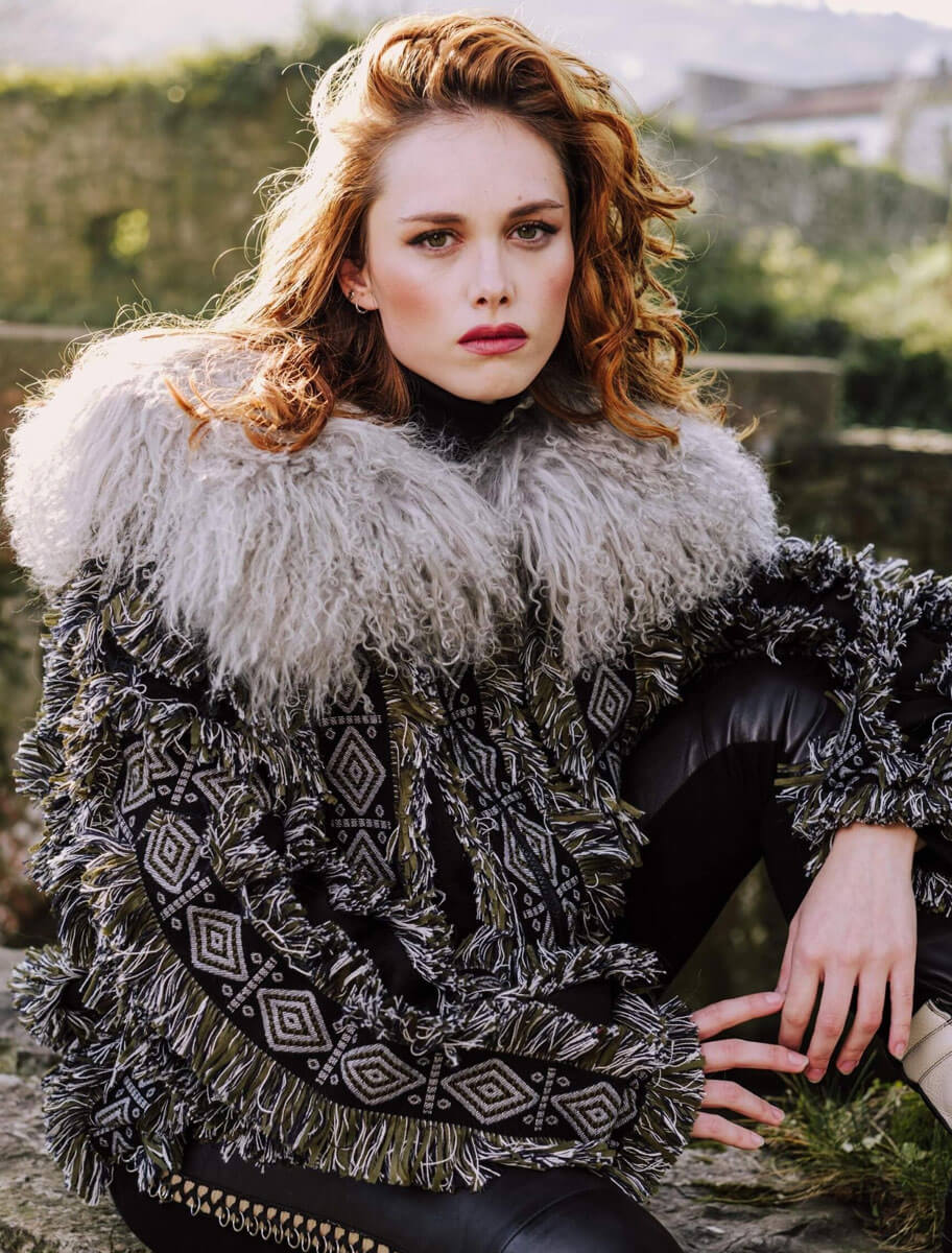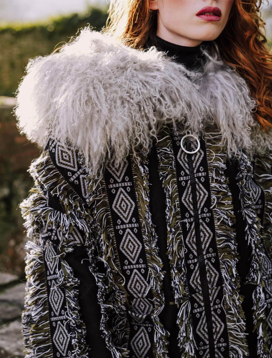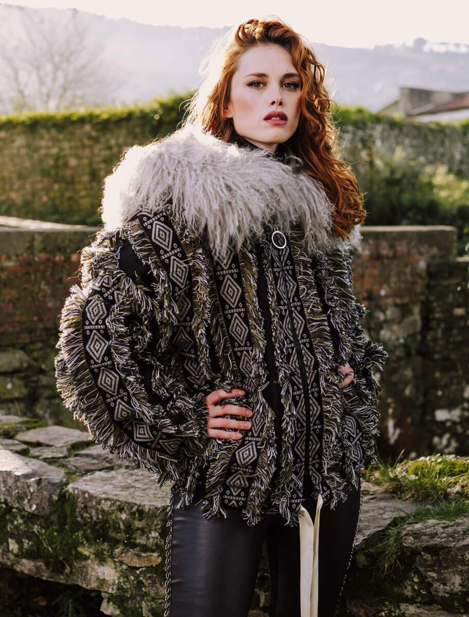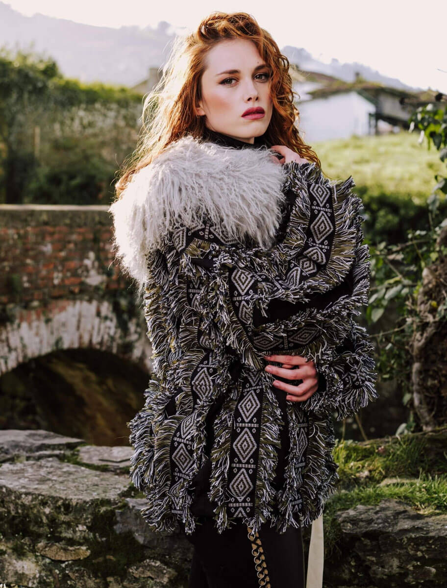 La chaqueta Sama Negra es una pieza de autor con carácter único, diseñada para quienes apuestan por la moda con personalidad. Confeccionada con tejidos de alta calidad procedentes de telares franceses, presenta un patrón geométrico en negro y blanco roto, realzado por detalles de flecos bicolor distribuidos en franjas verticales. El espectacular cuello de pelo natural en tono gris aporta volumen, textura y sofisticación.