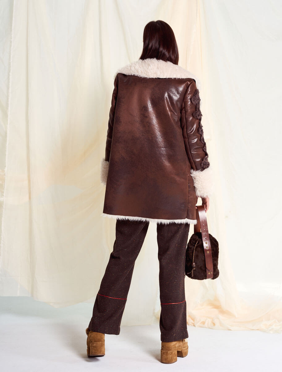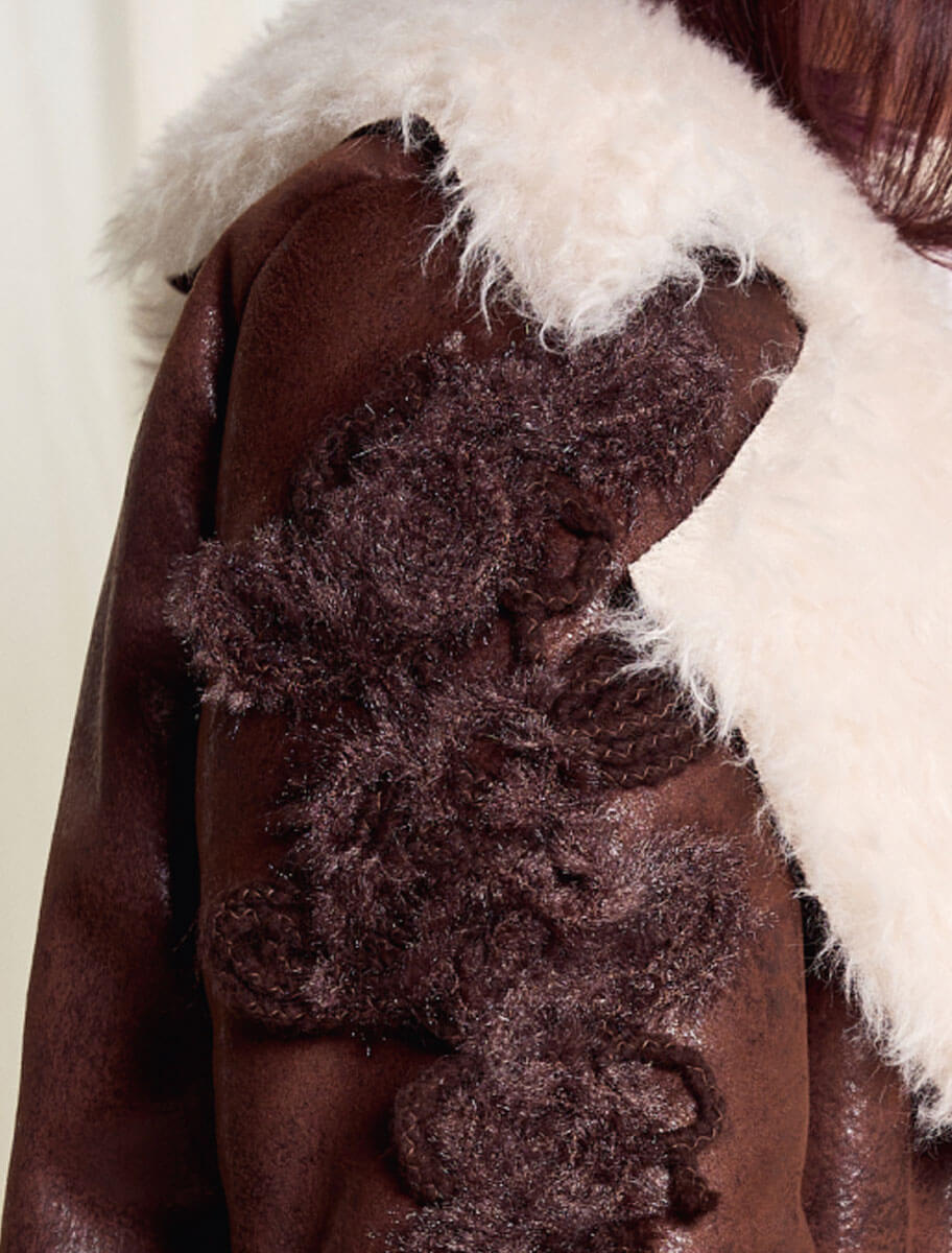 Inspirada en la resistencia de la naturaleza asturiana, la Pelliza Mahonia Marrón representa una combinación única de artesanía, diseño y calidez. Su tejido marrón con acabado brillante remite a la luz de invierno entre árboles, mientras el interior tipo borreguillo blanco aporta abrigo y textura.