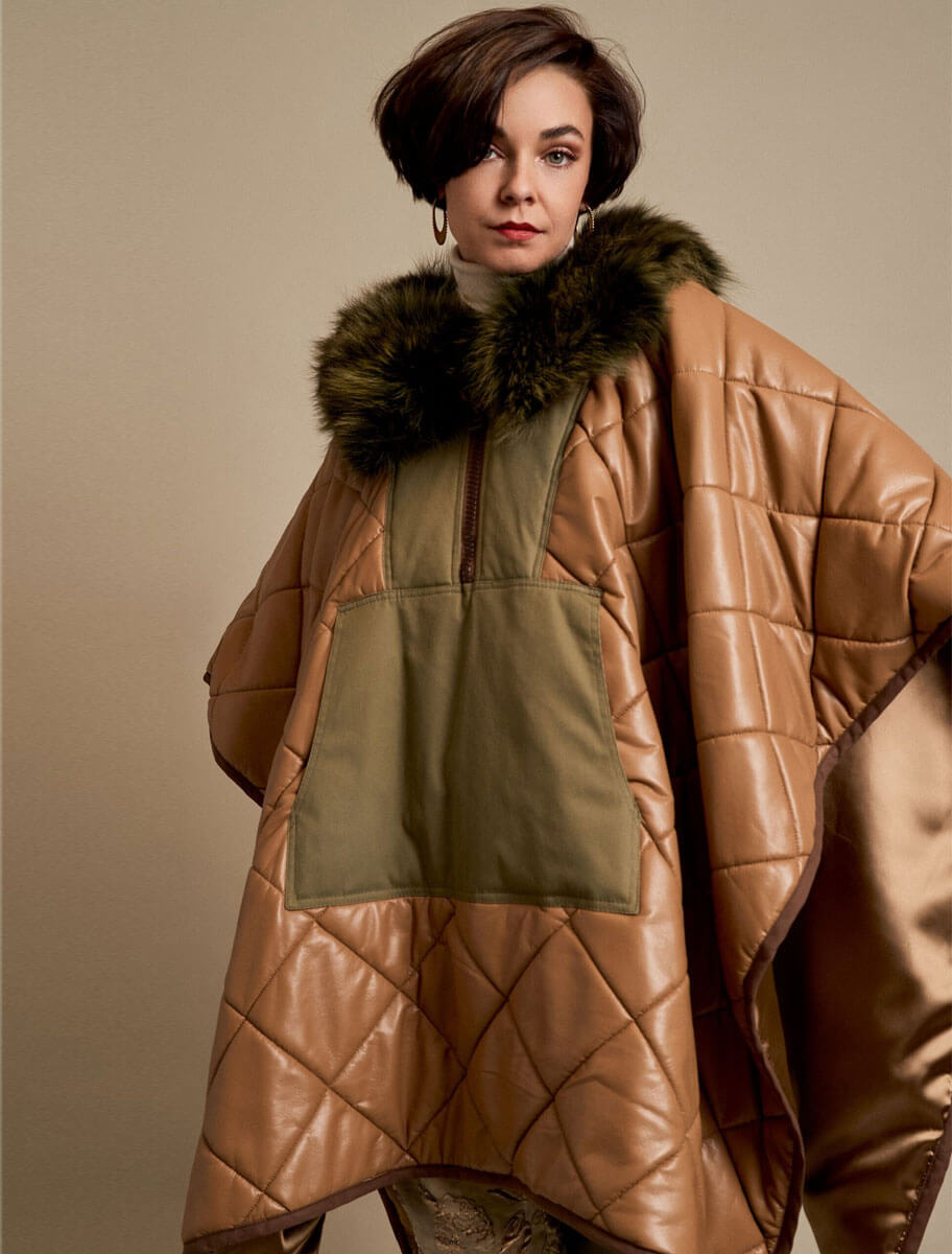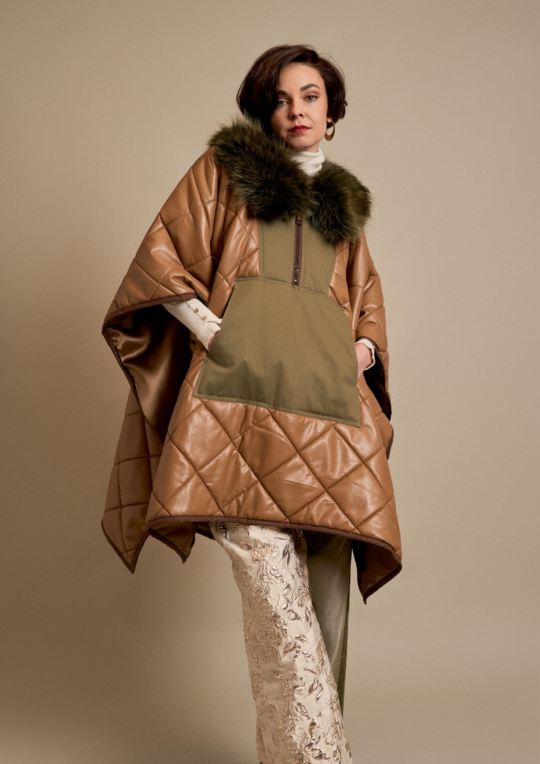 Poncho tejido guateado. Cerrado frontal con cremallera, cuello desmontable de racoon. Bolsos frontales. Forro de seda natural.